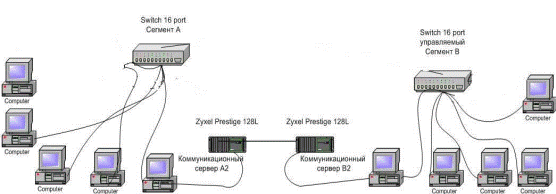 Asynchronous modems can lose to 25 % time for transmission and reception negotiation. Synchronous modems use accessible link speed more effective and provide faster communications than asynchronous modems. Remote bridge. It is the bridge intended for data transfer of one local segment through a wide-area network to other local segment. It builds the table of MAC-ADDRESSES on the basis of the traffic passing through it and on the basis of it makes solution – to transfer frames to a remote segment or not. If usual bridges do not almost find applications today the remote ones are applied rather often. They do not need to be configurated and this property proves to be very useful at remote offices where there is no qualified serving staff. Bridge. It works at a data link level. It’s a medium of frames transmission on the basis of the physical address between two segments using, as a rule, identical protocols of physical and link levels. Thus, bridges provide the extension of a network, which does not demand program modifications on workstations operating in local segments. All servers working in segments use unique addresses when interacting and do not have to distinguish obviously servers of an own segment and servers of other segments. Bridges care of it. The bridge should know, which addresses of the data link level (MAC-ADDRESS) belong to each segment to define which frames to skip, and which ones to return to its segment. For this purpose it has a scheme of operation with addresses. If some segments are linked by several bridges, each bridge should have the table of passing paths through bridges as well. To provide the operation in conditions when frames arrive faster, than they can be transferred, the bridge should have sufficient volume of the buffer. Unlike the switch the router supports protocols not only physical and data link levels, but also network one. Network layer protocols provide collection of the information about topology of connections between logical networks and construction of tables of routing with paths to all logical networks known to a router. (Methods of paths definition, optimal after the given criteria are considered in following section). On the basis of routing tables the router fulfils transmission of packages from one network to another and can make of solution for choice of the most rational path of an information transfer in difficult topology (topology with closed loops). It has some physical interfaces, including, various network technologies, and can also provide economic access to territorial networks as it isolates the local traffic more effectively. If the router is capable to support some protocols of a network layer, it is named a multiprotocol router. The range of functional tasks of a router also includes buffering, filtering and a fragmentation of packages. Therefore it is a typical computer with one or even several processors and with complicated software of real time. Since each package is handled by a router separately, its productivity considerably loses to productivity of the switch. There can be a bottleneck, hindering the traffic passing if it is set at the kernel level. The server computer can fulfill the router role in the case is the network layer of its operating system supports transmission of packages. Universal OS of Unix or Windows include the program unit providing setup of the mode “router”. Association of two remote local area networks by means of two Zyxel Prestige 128L modems (see Figure 3.2.1).