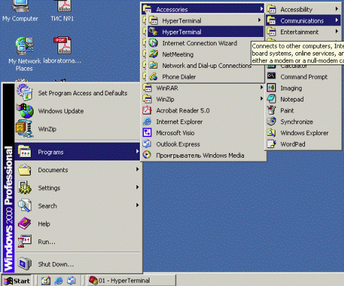 Names and descriptions of light-emitting diodes of the Prestige front panel: - PWR – the given light-emitting diode lights up at once, as soon as Prestige is connected to the power supply and switches in position «I» (on). - TST – the light-emitting diode blinks, if Prestige functions properly. - Line: LNK – this light-emitting diode shows, that the leased line (WAN port) is connected, to Prestige and it is initialized successfully. - 64К and 128К – the light-emitting diode 64К shows, that the speed of a line is 64К. A light-emitting diode 128К shows, that the speed of a line is 128К. - Ethernet: LNK – the given light-emitting diode shows, that Prestige is connected to a LAN through Ethernet interface. - ТХ and RX – light-emitting diodes (Transmit) of transmission and reception (Receive) show the LAN traffic presence. - COL – shows collision presence by transmission on a LAN. - SMT – shows, that Prestige it is connected to the control terminal through RS-232 port. - SERVER – shows, that Prestige sets synchronization to the leased line. Setup of Zyxel Prestige 128L bridge-router. Before start device setup, it is necessary to start program Hyper Terminal on the controlling terminal ( see the start path in Figure 3.2.4).