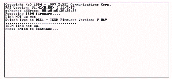 Select COM1 port from the dropping out list “Connect using:” Select from the dropping out list “Bits per second:» speed of connection – 9600kb/s. Select from the dropping out list “Flow control”: flow management – Hardware. After execution of above mentioned operations we get to a window of link with SMT (System maintenance terminal) a-firmware to handle Zyxel Prestige 128L. At power up Prestige will make some internal tests and initializes IDSL line. After initialization Prestige asks to press the Enter key to continue as follows in the Figure 3.2.6. When pressing ENTER, Prestige will display registration and ask to type the password, as shown in Figure 3.2.7. The password is 1234. Press Enter after password input.