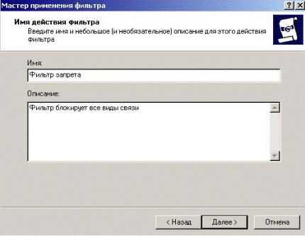 Figure 5.2.40 – Choosing of created filter In the opened window we choose action for the filter, in this case we choose created by us in point 5.2.7.2 action – «The ban filter» and we press «Next» (Fig. 5.2.41).