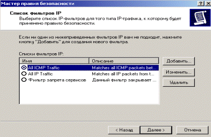 5.2.7.5 Permission of services (opening of ports). After prohibition of all services as required it is possible to open some main services. For permission of services we cancel the created policy and edit it. First of all it is necessary to permit ISMP traffic (for work of the utility ping). For editing of policy open its properties and on a tab of «Rule» press “add”, the master of creation of new rules is started. The following 4 steps are similar described in point 5.2.7.3. Having reached a window «List of filters», we will use already existing filter permitting ICMP traffic for permission of the ICMP protocol (Fig. 2.46).