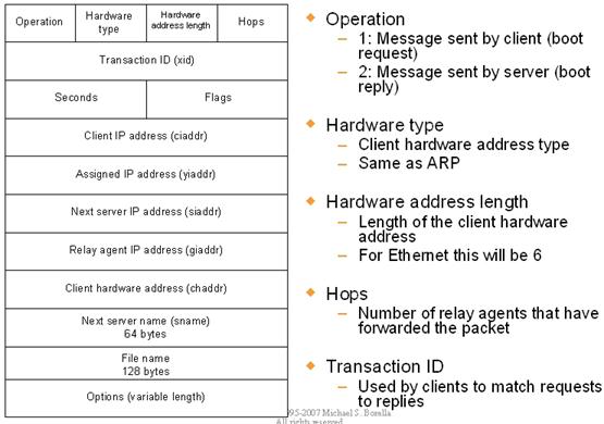 For sending of echo-request and receiving echo-answers utility (program) ping is used. The main purpose of DHCP is dynamic assignment of IP-addresses. However, apart from the dynamic, DHCP can maintain and easier ways manual and automatic static assignment. In automatic static way DHCP-server assigns the IP-address to the client from the pool (array) available IP-addresses without administrator intervention. The boundaries of the pool (array) of the assigned address by the administrator during configuration of DHCP-server. Between the customer ID and theassigned his IP-address, as well as for anual assignment, there is a match.It is installed at the moment of the initial assignment from the serverDHCP IP-address of the client. For all future requests (for IP-address receiving), the server returns to the client the same IP-address. In the dynamic allocation of addresses DHCP-server gives addressto the client for a limited time, which gives the opportunity to re-use that IP-address receiving to its computers. Dynamic address assignment enables build IP-based network, the number of nodes in which far exceeded the number available to the admin of IP-addresses. DHCP provides safe and easy way to configure TCP / IP network, ensuring that no conflicts of addresses by centralizing management of their distribution. The administrator manages the process of destination addresses with parameter «lease duration» (lease duration), which determines how long computer can use the assigned IP-address before you once againrequest it from the DHCP server for rent. Protocol DHCP uses a client-server model. During system startup DHCP - client is in the state of «init» and sends broadcast message discover (find) to search in the network of DHCP-server. DHCP-server receiving this message, replies to it with the message offer (proposal), which contains the IP-address and configuration information. When DHCP - client receives an offer from the DHCP-server it goes into a «request» state and sends a message to request to DHCP-server. DHCP-server sends Message DHCP-acknowledgment (confirmation), which contains the same IP-address which has already been sent earlier in the research stage, as well assetting of rent for the this address. In addition, DHCP-server sends settings of network configuration. Once the customer receives a confirmation, he goes into a state «connection» being in which he can participate in the work of the network TCP / IP.By the end of the rent term of IP-address computer tries to update the parameters of rent from DHCP- server, and if the IP-address can not be selected again, the computeris given another another IP-address. Figure 7.2.10 shows the format of the DHCP-packet.
