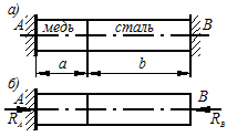 Эпюра нормальных напряжений представлена на (рис. 1.11 г). Знак минус поставлен потому, что продольная сила и напряжение сжимающее. Температурные и монтажные напряжения Задача 1.6 Стержень постоянного поперечного сечения, жестко закреплен обоими концами в неподвижных опорах (рис. 1.12 а). Часть длиной стали Определить напряжение в стержне. Решение При нагреве стержня он расширяется, и в закреплениях возникают опорные реакции