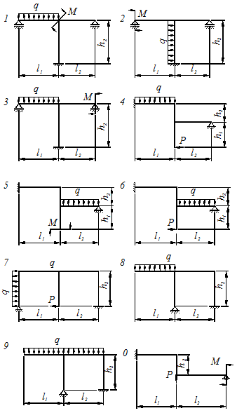 Побочные и грузовые перемещения могут быть положительными, отрицательными и равными нулю. Задача 5.2 Для плоского статически неопределимого ломаного бруса (рамы), показанного на рисунке 5.4, 5.5 и 5.6 построить эпюры внутренних усилий Примечание. Студентам заочникам одну из шарнирно-неподвижных опор, заменить шарнирно-подвижной, чтобы задача стала один раз статически неопределимой. Таблица 5.2