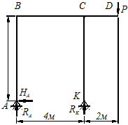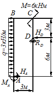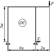 Рисунок 5.7 – Схема задания Для заданной рамы раскрыть статическую неопределимость, построить эпюры: нормальной силы, поперечной силы, изгибающего момента и подобрать сечения двутавровой балки. 1. Определяем степень статической неопределимости заданной схемы. Число неизвестных опорных реакций