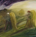 Картины, как и люди, обладают своим характером: бывают картины-отрицанияили картины-утверждения, пессимисты и оптимисты, милосердные и жестокие. Бывает, что картина говорит о жизни, а случается — витает в облаках. Но что бы ни писал художник, поэт, писатель — автор,— он всегда ведет речь о себе, а произведение отражает его душевный склад. Для Гели Писаревой мир неспокоен, но гармоничен, в нем нет восточной медитативности, зато читается какой-то извечный славянский пантеизм, вера в духов природы, в «правильность» всего происходящего. В этом мире деревенские бабы, как и столетия назад, уверенно и безмятежно сушат, ворочают, сгребают, стогуют сено. Травы оплетают их стопы, путаются в подолах платьев, а вселенная в это время кружится в невообразимом желто-фиолетовом хаосе. Конечно же, добрые женщины-богини защитят, укроют, вступятся и помогут каждому, потому что такова их природа. Безымянные охранительницы миропорядка по-другому не могут, их путь предрешен: от рождения и до смерти нести свое бремя —тяжелые и материальные крылья цвета скошенных полей, крылья, которые не могут унести от действительности. Элина Николаева