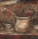 Работа Павла Бабенко «Первое блюдо», написанная языком эмоциональной, экспрессионистской живописи, также является ярким свидетельством эпохи, запечатлевшим время через предмет в жанре натюрморта. Ровный ряд алюминиевых плошек на скудном столе эпохи коммунистической уравниловки в монументальном натюрморте Бабенко, становятся яркими символами эпохи советской жизни, включенными в поток коллективной памяти.