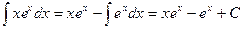 Этот способ интегрирования применяется в тех случаях, когда подинтегральная функция представляет собой произведение степенной и показательной функций, степенной и тригонометрической функций и т.д. @ Задача 5. Вычислить Решение: В подинтегральном выражении производятся замены x = u; exdx = dv, тогда v = ex; du = dx. После этого применяется формула (1):