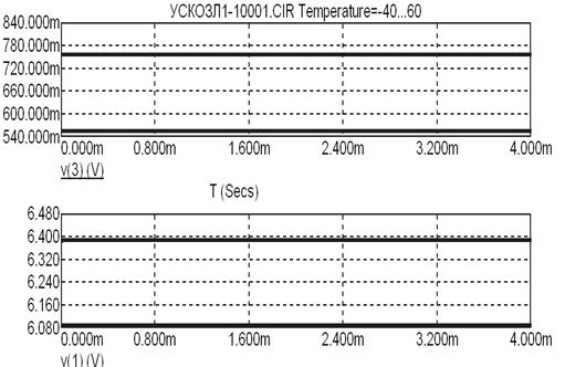 V (3) = 756 мВ и V (1) = 6.39 В для температуры окружающей среды -40оС; V (3) = 557 мВ и V (1) = 6.09 В для температуры окружающей среды +60оС Рисунок 3.37 – Эпюры напряжений в узлах схемы,