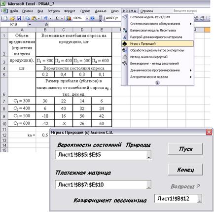 Для автоматизации расчёта в игровых моделях возможно использование программы «Игры с Природой» из ППП PRIMA. Для этого необходимо ввести в Excel платёжную матрицу прибылей и убытков (например, в ячейки В7:Е10), ввести также вероятности возможных ситуаций во внешней среде (например, в ячейки В5:Е5) и коэффициент пессимизма (например, в ячейку В12).