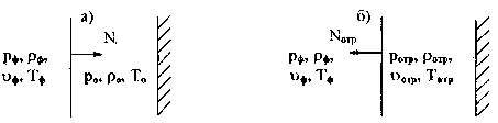 Параметры невозмущенной среды на этом рисунке обозначены через p0, r0, Т0, и u0, параметры среды за фоном ударной волны через рф, rф, uф, Тф; скорость перемещения фронта N. В момент встречи ударной волны со стенкой возникает отраженная волна, распространяющаяся в обратном направлении со скоростью Nотр, рис.33”б”. Её параметры обозначены через ротр, rотр, uотр, Тотр. Нормальная составляющая скорости частиц на стенке по условиям задачи равна нулю. Согласно формуле (4.50), для скорости воздуха в ударной волне имеет место соотношение