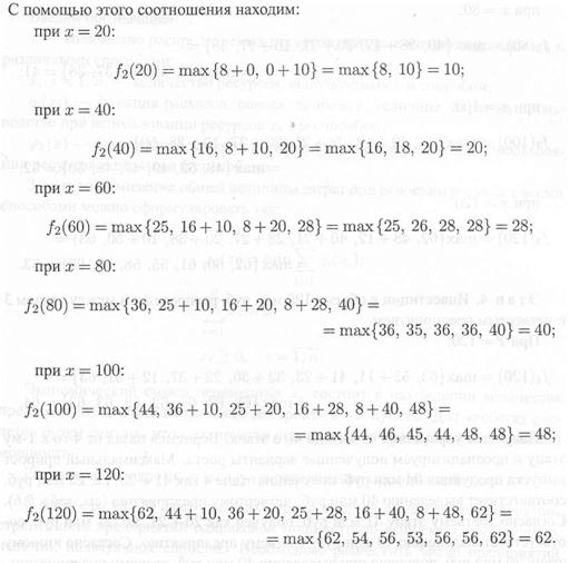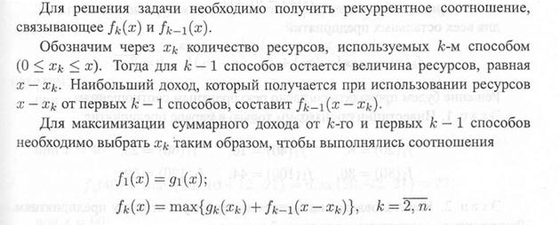 Оптимальное распределение ресурсов. Пусть имеется некоторое количество ресурсов х, которое необходимо распределить между п различными предприятиями (объектами, работами и т.д.) так, чтобы получить максимальную суммарную эффективность от выбранного способа распределения. Введем обозначения: хi, i = 1,n, — количество ресурсов, распределенных i-му предприятию; gi(xi) — функция полезности, в данном случае это величина дохода от использования ресурсов хi, полученных i-м предприятием; fk(x) — наибольший доход, который можно получить от первых k различных предприятий при использовании ресурсов х. Такую задачу можно записать в математической форме: