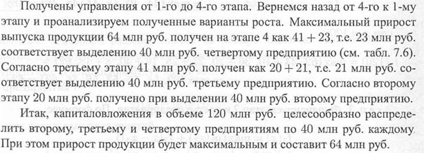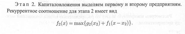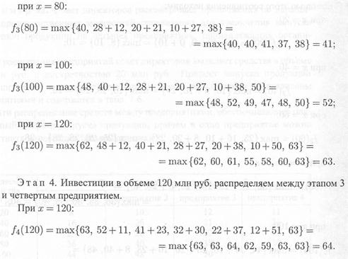 Решение. Разобьем решение задачи на четыре этапа по предприятий, в которые предполагается осуществить инвестиции. Рекуррентные соотношения будут иметь вид: для предприятия 1
