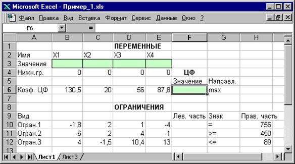 1.3.1.1. Ввод исходных данных Создание экранной формы и ввод в нее условия задачи Экранная форма для ввода условий задачи (1.1) вместе с введенными в нее исходными данными представлена на рис.1.1.
