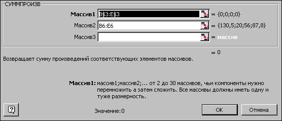 Примечание. Существует другой способ задания функций в Excel с помощью режима "Вставка функций", который можно вызвать из меню "Вставка" или при нажатии кнопки " · курсор в поле F6; · нажав кнопку " · выберите в окне "Категория" категорию "Математические"; · в окне "Функция" выберитефункцию СУММПРОИЗВ; · в появившемся окне "СУММПРОИЗВ" в строку "Массив 1" введите выражение B$3:E$3, а в строку "Массив 2" – выражение B6:E6 (рис.1.3); · после ввода ячеек в строки "Массив 1" и "Массив 2" в окне "СУММПРОИЗВ" появятся числовые значения введенных массивов (см. рис.1.3), а в экранной форме в ячейке F6 появится текущее значение, вычисленное по введенной формуле, то есть 0 (так как в момент ввода формулы значения переменных задачи нулевые).