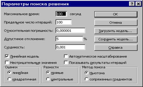 Параметр "Максимальное время" служит для назначения времени (в секундах), выделяемого на решение задачи. В поле можно ввести время, не превышающее 32 767 секунд (более 9 часов). Параметр "Предельное число итераций" служит для управления временем решения задачи путем ограничения числа промежуточных вычислений. В поле можно ввести количество итераций, не превышающее 32 767. Параметр "Относительная погрешность" служит для задания точности, с которой определяется соответствие ячейки целевому значению или приближение к указанным границам. Поле должно содержать число из интервала от 0 до 1. Чем меньше количество десятичных знаков во введенном числе, тем ниже точность. Высокая точность увеличит время, которое требуется для того, чтобы сошелся процесс оптимизации. Параметр "Допустимое отклонение" служит для задания допуска на отклонение от оптимального решения в целочисленных задачах. При указании большего допуска поиск решения заканчивается быстрее. Параметр "Сходимость" применяется только при решении нелинейных задач. Установка флажка "Линейная модель" обеспечивает ускорение поиска решения линейной задачи за счет применение симплекс-метода. Подтвердите установленные параметры нажатием кнопки "OK".