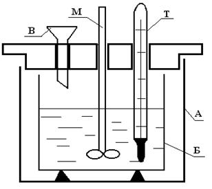 Рис.4. Калориметр. А – внешний сосуд, Б – внутренний сосуд, в который заливается реагент, Т – термометр, М – мешалка, В – воронка, через которую всыпается второй реагент.