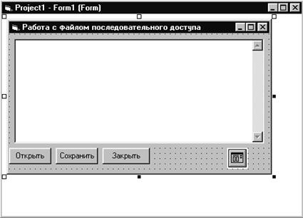 Рис. 34. Окно формы Работа с файлами последовательного доступа Из палитры компонент выберите библиотеку Microsoft Common Dialog Control 6.0. Разместите на форме объекты управления согласно рис. 34 и присвойте следующие значения их свойствам: текстовое поле Text1 (ScrollBars – 2-Vertical, MultiLine – True); три кнопки управления CommandButton1 - 3 (Открыть, Сохранить, Закрыть); элемент управления окна открытия и закрытия файлов CommonDialog1 (после компиляции и в режиме интерпретатора он не виден). Создайте программный код.