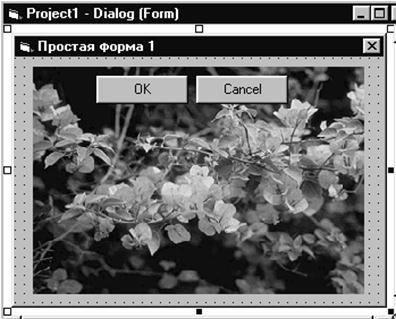 Создайте новый проект. Разместите на форме три управляющие кнопки CommandButton1 – 3 как показано на рис. 35. Создайте подчинённую форму (Проект \ Добавить форму). Для этого в окне Добавить форму (закладка Новый) выберите пиктограмму Dialog. На созданной форме разместите элемент управления Image1. Присвойте свойству Stretch значение True, свойству Visible – False. Загрузите картинку из Фотогаллереи (рис. 36). Создайте программный код.