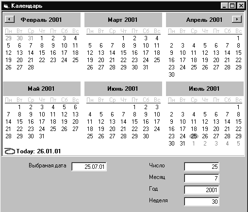 Создайте новый проект. Используя диалоговое окно Components (Проект \ Компоненты) выберите стандартную группу компонентов Microsoft Windows Common Controls-2 6.0. Разместите на форме элемент управления MonthView. Создайте календарь на полугодие (рис. 42). Для этого свойству MonthRows присвойте значение равное 2, а свойству MonthColumns – 3.