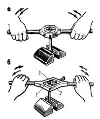 Упражнения по нарезанию наружной резьбы круглыми плашками включают следующие приемы. Взять заготовки с требуемым диаметром стержня. Подготовить инструмент к работе, для чего слегка отвернуть все винты на воротке (плашкодержателе), вставить плашку в гнездо воротка так, чтобы маркировка на плашке была наружу, а углубления располагались против стопорных винтов. Закрепить плашку в воротке стопорными винтами. Для разрезной плашки крайние регулировочные винты воротка отвернуть, а средний винт плотно завернуть, разжав плашку. Проверить штангенциркулем диаметр стержня и наличие на его конце фаски для облегчения врезания плашки. При отсутствии фаски опилить ее напильником. Приступая к нарезанию наружной резьбы плашками необходимо: закрепить стержень в тисках вертикально так, чтобы его конец выступал над губками тисков на 15...20 мм больше длины нарезаемой части, смазать конец стержня машинным маслом, наложить плашку на конец стержня так, чтобы маркировка была снизу, и, нажимая на корпус воротка ладонью правой руки, левой рукой вращать его за рукоятку по ходу часовой стрелки до полного врезания плашки, взяв вороток двумя руками, плавно вращать его по ходу часовой стрелки. После одного-двух оборотов необходимо сделать пол-оборота обратно, продолжать нарезание резьбы, обильно смазывая стержень маслом, снять плашку со стержня обратным вращением. При нарезании резьбы разрезной плашкой необходимо прорезать стержень на требуемую длину указанным выше способом и, сняв плашку обратным вращением, проверить резьбу резьбовым калибром-кольцом или контрольной гайкой. Если гайка или проходное кольцо не навинчивается, прорезать стержень ещё раз, регулируя размер резьбы плашки регулировочными винтами. При нарезании резьбы раздвижными плашками в клуппе необходимо подготовить инструмент к работе, для чего вложить в рамку клуппа последовательно полуплашки 1 и 2 и сухарь 3, так, чтобы маркировка на плашках была со стороны маркировки на корпусе клуппа, и слегка поджать сухарь нажимным винтом. При нарезании резьбы надеть плашку на конец стержня так, чтобы она охватывала стержень на ¾ своей толщины, и затянуть нажимной винт. Затем, смазав плашку и конец стержня маслом, прорезать стержень на требуемую длину, применяя способ, указанный для круглых плашек. Вращая клупп против часовой стрелки, установить его в первоначальное положение, повернуть нажимной винт на пол-оборота и снова прорезать резьбу на стержне (сделать второй – получистовой проход). Продолжать нарезание в таком порядке до получения полного профиля резьбы, проверяя резьбу калибрами-кольцами или контрольной гайкой. Качество работы проверяют внешним осмотром для обнаружения задиров и сорванных ниток, а точность калибрами-кольцами или контрольной гайкой (гайка должна навинчиваться легко, но без качания). На рис.10.6 показаны приемы нарезания наружной резьбы круглыми плашками и раздвижными плашками в клуппе.
