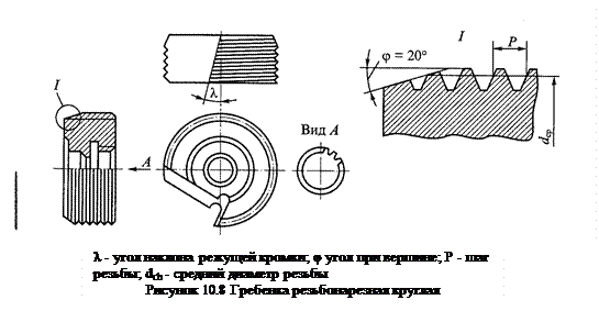 Перемещение плашек обеспечивает специальное поворотное устройство клуппа – планшайба, приводимая в движение рукояткой 4. Точная установка плашек на размер нарезаемой резьбы осуществляется по лимбу, имеющемуся на корпусе клуппа, а установочные перемещения происходят при помощи червячной передачи 3. После установки плашек на заданный размер резьбы их положение фиксируется нажимом специального упора - «собачки». После нарезания резьбы клупп не свинчивают с обработанной заготовки, а раздвигают плашки поворотом рукоятки 4 клуппа и снимают его с обработанной заготовки. Помимо режущих плашек в клуппе имеются и три направляющие плашки (гладкие, без резьбы). Они обеспечивают устойчивое положение клуппа на трубе в процессе обработки; их установка производится вращением червячного винта передачи 3. На трубах диаметром ½ дюйма и меньше резьбу вручную нарезают специальными трубными круглыми плашками. При нарезании резьб на трубах следует учитывать характер соединения их в трубопроводе. При нарезании резьбы для неразъемного трубного соединения длина нарезанной части трубы должна составлять ½ длины соединительной муфты за вычетом длины резьбы, приходящейся на 1...1,5 витка резьбы. При нарезании резьбы для разборных трубных соединений («на сгон») на одной трубе нарезается резьба, как для неразъемных соединений, а на другом конце трубы длина нарезанной части должна составить сумму длины соединительной муфты, контргайки минус 1...1,5 длины витка для данной резьбы. Гребенки резьбонарезные круглые (рис. 10.8) используются для нарезания трубной резьбы на металлорежущих станках (токарных и сверлильных) с помощью специальных патронов. Гребенки выпускаются комплектами из четырех штук; резьба каждой гребенки комплекта смещена по отношению к предыдущей на ¼ шага резьбы.