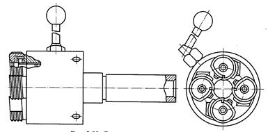 При нарезании наружных резьб на сверлильных и токарных станках применяют специальное приспособление – плашкодержатель с автоматическим отключением подачи (рис. 10.10). Приспособление состоит из хвостовика, на котором установлена втулка с запрессованными в нее пальцами 2. Во втулку ввинчены винты 4, концы которых могут входить в отверстие муфты 5. Внутри муфты размещен регулировочный винт 6. Плашка закрепляется винтом в гнезде корпуса 1.