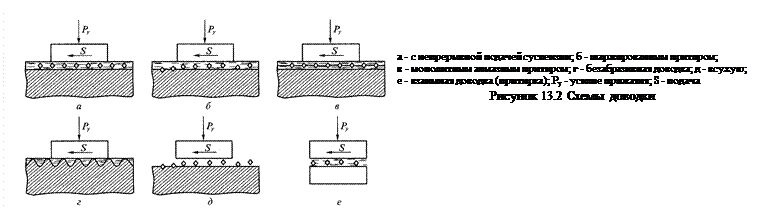 4. Доводка монолитным алмазным притиром (рис.13.2, в) выполняется дисками, имеющими на рабочей поверхности алмазный слой. Это наиболее производительный метод доводки, однако, он не позволяет полностью использовать режущие возможности алмазного слоя. 5. Безабразивная доводка (рис.13.2, г) применяется при обработке заготовок из мягких или пористых материалов. 6. При обработке всухую (рис.13.2, д) получают зеркальную поверхность. 7. Взаимная доводка (притирка) используется для подгонки деталей с высокой точностью (рис.13.2, е).
