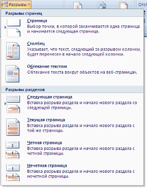 Разрывы страницы и раздела При работе с документами зачастую возникает необходимость начать новую страницу, в то время как предыдущая еще не заполнена полностью текстом. Например, в книге так начинается новая глава. Разрывы можно, конечно же, делать с помощью необходимого количества нажатий клавиши «Ввод», однако, к такому методу ни в коем случае нельзя прибегать! Стоит только внести небольшую правку в документ (вставка или удаление всего пары-тройки слов), как вся верстка документа «съедет». Придется «перелопачивать» весь документ для исправления разметки. Чтобы начать новую страницу в Microsoft Office Word 2007 есть специальная опция - «Разрывы».