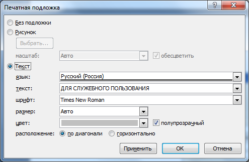 Рис. 46. Окно печатная подложка Для создания текстовой подложки надо установить переключатель в положение «Текст», ввести нужный текст, настроить необходимые параметры: язык, шрифт, цвет и расположение надписи, прозрачность. Для создания графической подложки надо установить переключатель в положение «Рисунок» и нажать кнопку «Выбрать». Затем указать место размещения нужного файла изображения. При желании можно отредактировать представленные в галерее стандартные подложки. Для этого надо щелкнуть на выбранном варианте правой кнопкой мыши и выбрать команду «Изменить свойства». Удалить подложку из галереи можно с помощью пункта «Удалить подложку».