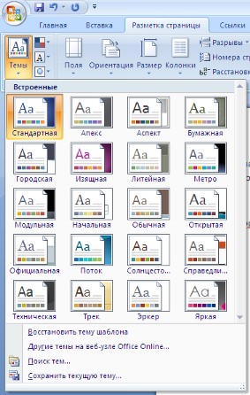 Рис. 49. Галерея тем Темы можно удалять и редактировать с помощью кнопок группы «Темы»: Цвета темы; Шрифты темы; Эффекты темы. Следует иметь ввиду, что при изменении параметров шрифтов будут модифицированы используемые в документы стили. Чтобы сохранить новую тему в виде отдельного файла, нужно нажать кнопку «Темы» и выбрать пункт «Сохранить текущую тему». Тема добавится в галерею, в которой появится область «Пользовательские».