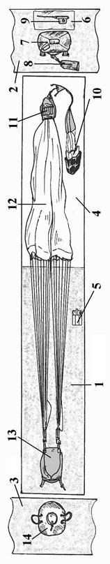 Первый этап. Проверка наличия и 1. Вытянуть парашютную систему на всю длину (рис. 2.1). Запасной па-рашют (если не требуется его пере-укладка) и переносную сумку поло-жить на верхнее окантовочное полотнище. 2. Проверить закрепление парашютной системы (стеллажный номер). 3. Проверить наличие частей. 4. Проверить техническое состояние частей. 5. Проверить наличие и монтаж шнуров блокировки на свободных концах. 6. Смонтировать трос звена ручного раскрытия в гибкий шланг и вставить кольцо в карман. 7. Проверить на расчековочном устройстве присоединение правой пары свободных концов к изогнутой пряжке звеном и его зачековку шпилькой-чекой с резиновой сотой. Текстильную застежку расстегнуть. 8. Снять с ранца страхующий парашютный прибор, произвести его внешний осмотр и положить на верхнее окантовочное полотнище. 9. Проверить положение строп, распутать их в случае необходимости.