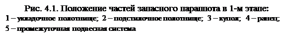 Вынимают запасной парашют из сумки и растягивают на всю длину на середине подстилочного полотнища (рис. 4.1). Кладут ранец и звено ручного раскрытия рядом с промежуточной подвесной системой, парашютную сумку складывают и размещают рядом с уложенной основной парашютной системой. В первую очередь проверяют соответствие номера паспорта номеру на куполе, затем проверяют наличие всех частей и их техническое состояние. При осмотре купола проверяют, нет ли порывов ткани и нарушения строчек на карманах, полюсном отверстии и вершине купола, не повреждена ли шнуровая петля красного цвета, нет ли порывов на лентах усилительного каркаса, нет ли повреждений на строчках пришивки секторов и полотнищ. Проверяют состояние строп по всей длине, начиная от нижней кромки купола до полуколец промежуточной подвесной системы. После проверки купол разделяют на две части и готовят к укладке. Осматривая промежуточную подвесную систему, проверяют надежность крепления винтов полуколец и наличие на них контровочной покраски, нет ли потертостей и порезов на свободных концах и перемычке, не нарушены ли строчки их прошивки, нет ли забоин и заусенцев на втулках. При осмотре ранца с внутренней стороны проверяют резиновые соты, нет ли порывов клапанов ранца и потертостей на углах рамы жесткости. С внешней стороны ранца проверяют исправность конусов и прочность их крепления к клапану, надежность крепления проволочных петель для ранцевых резин, нет ли деформации и повреждений на пряжках-люверсах, не порван ли карман для кольца звена ручного раскрытия, не повреждены ли шланг, пластины жесткости, люверсы, карманы, надежно ли крепятся двойные ранцевые резины. При осмотре звена ручного раскрытия проверяют, не погнуты ли шпильки и нет ли на них заусенцев и ржавчины, не нарушены ли оплетка и опайка в местах крепления шпилек к тросу, нет ли порывов нитей троса, надежна ли заделка ограничителя троса. После проверки трос вставляют в шланг, а кольцо в карман клапана. Клапаны ранца (кроме левого) подгибают вниз, ранец кладут на укладочное полотнище резиновыми сотами вверх, а на него накладывают промежуточную подвесную систему.