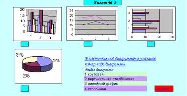 Рис.5 Лист под названием «Билет №2» (рис.6) содержит диаграммы, которые были выполнены в Excel на данном листе рабочей книги. Под каждой диаграммой есть ячейка для ввода номера вида диаграммы. Названия видов диаграмм пронумерованы и приводятся на данном листе.