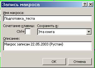 Рис.13. Защитить расчетный лист можно следующим образом. Надо сначала выделить весь расчетный лист, щелкнув на специальной кнопке, которая находится на пересечении номеров строк и названий столбцов в верхнем левом углу рабочего листа. После выделения следует присвоить шрифту белый цвет, т. е. цвет фона. Теперь расчетный лист будет казаться пустым. Далее надо выбрать команду Сервис, Защита, Защитить лист, два раза ввести пароль и щелкнуть на кнопке ОК. Лучше, если пароль защиты этого листа будет отличаться от пароля защиты других листов. Затем для контроля надо попробовать активизировать кнопку, отвечающую за цвет шрифта, и посмотреть, стала ли она активной. Если она неактивна, то все в порядке. После установления защиты также невозможно изменить ширину и высоту ячеек, становятся недоступными многие опции и проведение многих операций с данными и ячейками. Далее этот лист можно скрыть (Формат, Лист, Скрыть). До того как файлу, содержащему тест, будет присвоен атрибут Только для чтения, записываем макрос, который подготовит Excel к проведению теста, т.е. очищает все ячейки, которые тестируемый будет заполнять, от возможных остатков предыдущего тестирования. После этого начать запись макроса: задать имя макроса «Подготовка_теста» (рис.14), сохранить макрос в этой книге макросови щелкнуть на кнопке ОК.