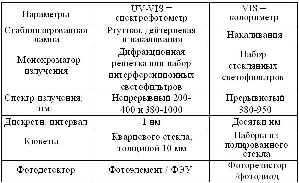 Рис. 4.4. Схема методов фотометрии (по http://www.krugosvet.ru/ articles/ 23/ 1002315/1002315a1.htm) Нередко фотометрию сводят к молекулярно-абсорбционному анализу, основанному на объединенном законе светопоглощения Бугера-Ламберта-Бера. Согласно ему, в стандартных условиях кюветного отделения и длины волны, перпендикулярной толщине слоя однородной среды (l), между концентрацией (С) поглощающего вещества и соотношением интенсивностей исходного = Ф0 и достигшего детектора = Ф1 потоков излучений, возникает логарифмическая зависимость: С = lg Ф0/Ф1. Отсюда появился не очень точный, но распространенный синоним – концентрационный анализ. При стандартных λ и толщине образца, количество света достигшее фотодетектора выражают линейной шкалой светопропускания = Т (transition), которую для удобства в работе, обычно градуируют в %. К сожалению, она не имеет прямого отношения к свойствам образца, ослабляющего интенсивность излучений за счет поглощения = А (absorbtion) или, таких устаревших понятий, как оптическая плотность = D (density) раствора и коэффициент его экстинкции = Е. С другой стороны, зависимость 2 – lg T = А, обеспечивает высокую точность измерения концентраций в диапазоне 0,2-0,8 безразмерной логарифмической шкалы от 0 до ∞. Во избежание оптических эффектов, способных исказить результаты, фотометрию проводят в закрытых кюветных отделениях фотометров, а хрупкие кюветы с плоскопараллельными стенкам – берегут от падений, царапин, потеков и капель. По той же причине, нельзя касаться руками оптических стенок кювет, а после употребления – их тщательно моют с мылом и хранят в дистилляте, высушив перед следующим измерением. Чтоб кюветы не запотевали, их заполняют растворами комнатной температуры до уровня, при котором поток света целиком проходит через раствор. Таблица 4.2 Сравнительная характеристика фотометров