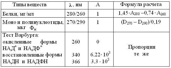 В таблице 4.2 представлены важнейшие эксплуатационные характеристики однолучевых фотометров, предназначенных для измерений в УФ и видимой областях спектра. Так как у колориметров они гораздо проще, то и стоимость их ниже, примерно на порядок. Спектрофотометрия в УФ диапазоне позволяет: 1) идентифицировать вещества по их характерным спектрам поглощения; 2) при стандартной длине УФ лучей измерять в 1 М водных растворах многих веществ, их важнейшую спектральную характеристику – молярный коэффициент абсорбции (табл. 4.3). Этот неразрушающий метод позволяет экономить препарат, сводя измерение концентраций к замеру спектральных максимумов поглощения биомолекул. Аналогично, рутинные измерения активности ферментов упрощают до т.н. теста Варбурга, определяя в стандартных условиях, прирост или убыль 1 мкмоль НАДН (НАДФН). Таблица 4.3 Расчет концентраций биомолекул по их спектральным характеристикам УФО
