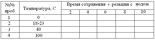 11.3.4. Зависимость активности амилазы от температуры 1. В 4 маркированных пробирки разлить по 2 мл 0,2 % раствора крахмала. 2. Разместить пробирки: № 1 – в чашке со льдом; № 2 – в штативе на лабораторном столе; № 3 – в водяной бане с качалкой при 40С и, № 4 – в кипящей водяной бане. 3. Для контроля хода гидролиза субстрата с помощью йодной реакции, поместить во все пробирки стеклянные палочки. 4. Через 5-7 мин, когда растворы субстрата примут окружающую температуру, во все пробирки добавить по 0,5 мл слюны, разведенной в 10 раз. 5. Для лучшего контакта Е с субстратом, перемешать содержимое пробирок. 6. Через 2 мин нанести на предметное стекло 4 отдельных капли раствора Люголя и, с помощью стеклянных палочек, смешать с ними по капле инкубационных смесей из пробирок. 7. Высушив палочку фильтровальной бумагой, вернуть ее в соответствующую пробирку и занести результаты йодного теста в протокол опыта, оформленный в виде таблицы: