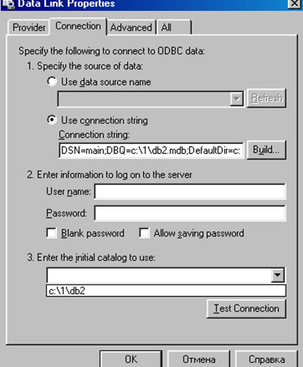 18. Протестируйте работу отчета из приложения. 19. Для создания 2-го отчета добавим в проект VB элемент DataEnvironment1, как правило элемент добавляется сразу с 1 подключением (Connection1). 20. Вызовите окно свойств (Properties) Connection1 и в открывшемся окне выберите вкладку Connection. На вкладке выберите переключатель Use connection string (строка подключения). Станет доступно текстовое поле в котором будут сформированы параметры подключения БД.