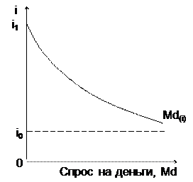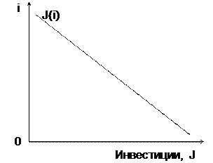 Р и с. 1. Функция сбережений Р и с. 2. Спрос на деньги Для сбережений получается обратная картина: повышение процента, вызывая снижение уровня потребления, будет способствовать повышению уровня сбережения. Сбережения могут делаться в деньгах или ценных бумагах, приносящих процент: путем покупки акций или облигаций, банковских вкладов и т.п. Ликвидная форма сбережений - деньги, банковские билеты и вклады, подлежащие оплате по предъявлению, - связана с меньшим риском, чем влaдeниe ценными бумагами, рыночная цена которых не постоянна. Но владение ценными бумагами дает преимущество - право на получение процента. Экономический агент имеет свободу выбора и отдает "предпочтение ликвидности", т. е. не стремится превращать деньги в ценные бумаги, если ставка процента очень низка, и, напротив, вкладывает деньги в ценные бумаги, если ставка процента высока. При норме процента i0 спрос на деньги (денежный резерв для реализации торговых сделок не учитывается) становится бесконечно эластичным, т. е. каждое повышение сбережений будет выражаться в форме ликвидных денежных средств. При норме i0 никто не будет держать сбережения в деньгах и любое повышение сбережений выразится в приобретении ценных бумаг (рис. 2). В условиях развитой рыночной системы процент регулируется государством, центральным банком. Таким образом осуществляется воздействие на поведение экономических субъектов, потребление и сбережение. Норма процента оказывает непосредственное влияние на инвестиции, капиталовложения. Если предприниматель использует заемный капитал, то такое вложение может быть выгодным только в том случае, если предполагаемый доход (норма прибыли) будет выше нормы процента. Но и в том случае, если он работает со своим собственным капиталом, всегда учитывается возможность его альтернативного использования (альтернативной стоимости), величина которой приблизительно равна норме процента. Таким образом, инвестиции являются убывающей функцией нормы процента (рис. 3).
