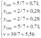 Точный результат решения задачи (читатель может восстановить процесс расчета самостоятельно на основе п. 2.5, подробное решение – в примере 6в, где вероятности применения Получателем его стратегий А 1 и А 2 обозначаются x 1 и x 2)