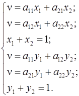 Ограничимся рассмотрением платежных матриц размера И первый, и второй игроки (Получатель и Плательщик) при применении их смешанных стратегий должны достичь средней величины платежа n (причем a< n < b в серии многократных игр). Смешанная стратегия Получателя состоит в применении его стратегии А 1 с вероятностью x 1 и стратегии А 2 с вероятностью x 2; смешанная стратегия Плательщика состоит в применении его стратегии В 1 с вероятностью y 1 и стратегии В 2 с вероятностью y 2. Эти вероятности являются искомыми величинами. Между собой они попарно связаны соотношениями x 1 + x 2 =1, y 1 + y 2 =1. Предположим, что Плательщик достаточно много раз применяет свою стратегию В 1. Тогда для средней величины платежа должно выполняться равенство: n = a 11 x 1 + a 21 x 2, где a 11 и a 21 – элементы первого столбца платежной матрицы. В качестве альтернативы примем, что Плательщик достаточно много раз применяет свою стратегию В 2. Тогда для средней величины платежа должно выполняться равенство: n = a 12 x 1 + a 22 x 2, где a 12 и a 22 – элементы второго столбца платежной матрицы. С точки зрения Плательщика рассмотрим две взаимно альтернативные возможности, которые может предоставить ему Получатель: при условии применения Получателем стратегии А 1 средняя величина платежа должна составить n = a 11 y 1 + a 12 y 2, где a 11 и a 12 – элементы первой строки платежной матрицы; наконец, при условии применения Получателем стратегии А 2 средняя величина платежа должна составить n = a 21 y 1 + a 22 y 2 , где a 21 и a 22 – элементы второй строки платежной матрицы. Из полученных равенств составим систему уравнений для нахождения всех искомых величин, вероятностей применения стратегий и цены игры