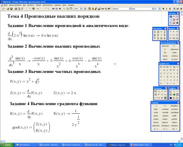 Рис.4. Аналитическая форма задания скалярной функции векторного аргумента и векторной функции векторного аргумента (градиента). 4. Матричный аппарат MathCad Понятие матрицы. Размер матрицы. Квадратная, симметричная, диагональная, единичная матрицы. Подменю матричной алгебры в MathCad.