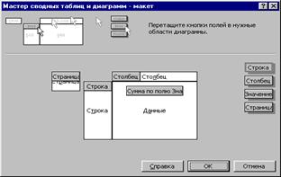 · Перейти в диалоговое окно Шаг 3 из 3 и задать поле вывода сводной таблицы – Новый рабочий лист. В этом же окне вызвать кнопку Макет для организации информации в сводной таблице. По умолчанию установлен следующий макет сводной таблицы – в столбцах выводятся наименования супермаркетов, в строках – наименование товара. В этом случае суммирование объема продаж будет производиться по кварталам. По условию нужно получить сводную таблицу по общим объемам продаж по видам товаров. Для изменения алгоритма суммирования в макете таблицы нужно поменять местами поля Строка и Страница. Для этого нужно захватить мышкой нужный элемент из ряда кнопок, расположенных справа, а затем нанести его на нужное место - область строки или столбца, или страницы. После создания макета можно выбрать кнопку Параметры и задать заголовок сводной таблицы.