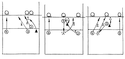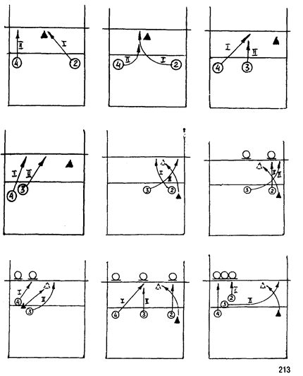 1-11 — а) Прием мяча, переброшенного через сетку на связующего игрока в зону 3 (2, 4); б) То же, но в момент полета мяча к принимающему игроку, связующий меняет месторасположение; в) То же, но после приема подачи; г) То же, что в а), б), в), но прием мяча на связующего игрока выходящего с задней линии из зоны 1 (6, 5); Ш-1V — д) То же, что в а), б), в), г), но передача одному из 2-3-х нападающих игроков без блока, с блоком (см. схемы).