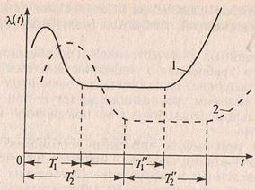 Численные значения КН времени выжигания определяются путем проведения специальных испытаний элементов при различных коэффициентах нагрузки и на основании статистических данных об отказах этих элементов. По этим сведениям строятся кривые λ = f(t) и по характеру кривых устанавливаются коэффициент нагрузки и время выжигания. Если интенсивность отказов по статистическим данным сохраняет постоянную величину, а параметры элемента уходят за допустимые пределы, то такой режим выжигания является недопустимым. Облегчение режимов работы элементов. Снижение нагрузки элементов, уменьшение их тепловых, вибрационных и других режимов приводит к уменьшению вероятности появления отказа. Поэтому облегчение режимов работы является одним из возможных путей повышения надежности оборудования. В подавляющем большинстве современных систем элементы работают в загруженном режиме. Изменение интенсивности отказов в номинальном (кривая 1) и недогруженном (кривая 2) режимах работы элементов показано на рис. 40.