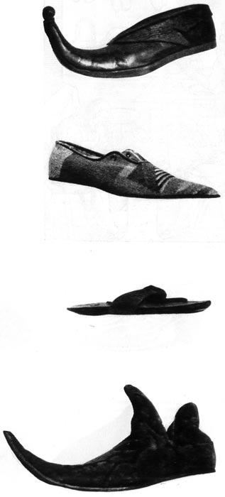 Скулпонэ - деревянные башмаки римских рабов и бедноты. Триппен (Tripperi) - в XV и XVI веках своего рода верхняя обувь, которая надевалась на клювовидные ботинки. Эта обувь делалась на деревянной подметке, которая присоединялась к ботинку с помощью кожаных ремешков. Чулки-панталоны (Beinling). В XII веке бывшие в повседневной носке чулки-панталоны разделяются на панталоны и длинные чулки, которые присоединяются к первым с помощью шнуровки. К этой одежде носят высокие ботинки - до щиколотки. Иногда же к чулку просто прикреплялась кожаная подошва. С XV века чулки срастаются с панталонами в одно целое (см. bruche). Эскарпэн (escarpin) — появились в конце XVIII века, сначала без каблуков и носились с камзолом и брюками до колен. В XIX веке они стали принадлежностью бального туалета мужчин. Иногда также называются Schallenschuhe - ботинки с пряжкой.