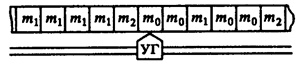 Рис. 9.3 Вдоль бесконечной ленты, разделенной на клетки, перемещается управляющая головка (УГ). Заданы внешний алфавит М = { m 1, m 2,..., mn }, внутренний алфавит S = { S 0, S 1,..., Sr }, и алфавит перемещений D = { П, Л, Н }. Все клетки ленты заполнены символами из M. Управляющая головка может находиться в тех или иных состояниях, характеризуемых символами из S. Состояние S 0 особое. Если УГ находится в состоянии S 0, то машина не производит никакой работы (выключена). Предполагается, что в конце работы машина всегда переходит в состояние S 0. В процессе работы машины УГ может перемешаться в дискретные такты времени вдоль ленты. Перемещение происходит либо на одну клетку вправо (П), Либо на одну клетку влево (Л). Перемещение УГ в данный такт работы может отсутствовать (Н). В каждый такт работы УГ совершает следующие действия: 1) считывает символ mi, находящийся в клетке ленты, которую в этом такте видит УГ; 2) в соответствии со считанным символом mi, и своим состоянием Sj записывает символ mk в эту клетку; 3) движется (не движется) вдоль ленты; 4) переходит в следующее состояние Sp. Всю работу машины можно задать с помощью функциональной таблицы Т, в клетках которой стоят тройки вида mk, Sp, di, где di Î D — символ, определяющий перемещение. Таким образом, функциональная таблица определяет отображение M ´ S в M ´ S ´ D. Содержательный смысл отображения (mi, Sj) ® (mk, Sp, di)состоит в том, что, находясь в состоянии Sj и считывая из клетки символ mi, УГ записывает в данную клетку ленты символ mk, переходит в состояние Sp и производит движение, определяемое символом di. Условимся, что функциональная таблица всегда устроена так, что имеет место отображение (mi, S 0) ® (mi, S 0, H). Это означает, что в выключенном состоянии машина не работает. До начала функционирования машины (если это необходимо) надо заполнить некоторые клетки ленты символами, отличными от m 0, перевести УГ в состояние, отличное от S 0, и задать исходное положение УГ относительно ленты. После этого машина будет функционировать в соответствии с таблицей Т. Функционирование машины можно задать с помощью графа, вершины которого взаимно однозначно соответствуют состояниям этого устройства, дуги – переходам из одного состояния в другое, при этом каждая дуга (Si, Sp) взвешена парой (mi, mkdl).