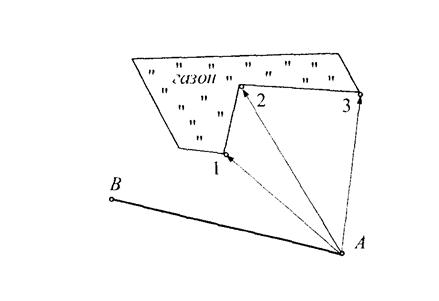 5) Выбрать и закрепить 3 реечные точки. Выполнить схематический чертёж – абрис тахеометрической съёмки (рис.14).На нём зарисовать ситуацию, нанести точки съёмочного обоснования и указать положение реечных точек. Следить за совпадением номеров реечных точек на абрисе и в журнале тахеометрической съёмки.