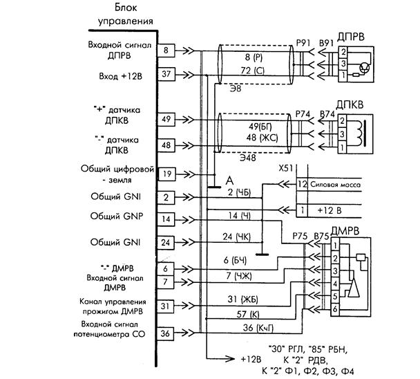 Рис. 2.5.2 Цепи датчиков УСЛОВИЯ: • двигатель запущен; • массовый расход воздуха через датчик меньше 0,05 кг/час; • выходное напряжение с датчика массового расхода воздуха меньше 1,5 В (контакты 2 и 3 в розетке Р75). ЧТО ПРОВЕРЯТЬ 13.1. Обрыв нити чувствительного элемента датчика. 13.2. Обрыв в проводе 57 (К). 13.3. Замыкание провода 57 (К) на "массу". 13.4. Замыкание провода 7 (ЧЖ) на "массу". Провод 7 соединяет контакт 3 датчика массового расхода с контактом 7 блока управления. 13.5. Короткое замыкание между проводом 6 (БЧ) и проводом 7 (ЧЖ), или проводом 56 (Ч)) и проводом 7(ЧЖ). КАК ПРОВЕРЯТЬ 13.1.1. Демонтируйте датчик массового расхода и визуально проверьте сохранность чувствительного элемента датчика (платиновой нити). 13.2.2. Отключите блок управления и датчик массового расхода воздуха от жгута проводов. Убедитесь в отсутствии обрыва в проводе 57 (К), измерив сопротивление между контактами 5 в розетке Р75 и контактом 1 в диагностической розетке Х51. 13.3.3. При отключенном блоке управления и датчике массового расхода воздуха убедитесь в отсутствии замыкания провода 57 (К) на "массу" двигателя, измерив сопротивление между контактом 5 в розетке Р75 и "массой" двигателя. 13.4.4. При отключенном блоке управления и датчике массового расхода воздуха убедитесь в отсутствии замыкания провода 7 (ЧЖ) на "массу", измерив сопротивление между контактом 3 в розетке Р75 и контактом 7 в розетке соединителя блока управления. 13.5.5. При отключенном блоке управления и датчике убедитесь в отсутствии замыкания между проводом 7 (ЧЖ) и проводом 6 (БЧ), измерив сопротивление между контактами 6 и 7 в розетке соединителя блока управления. После устранения неисправности включите зажигание, при помощи прибора DST 2 сбросьте коды неисправностей, запустите двигатель и проконтролируйте отсутствие кода 13.